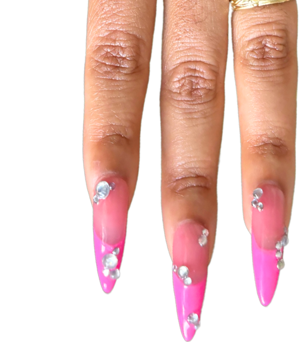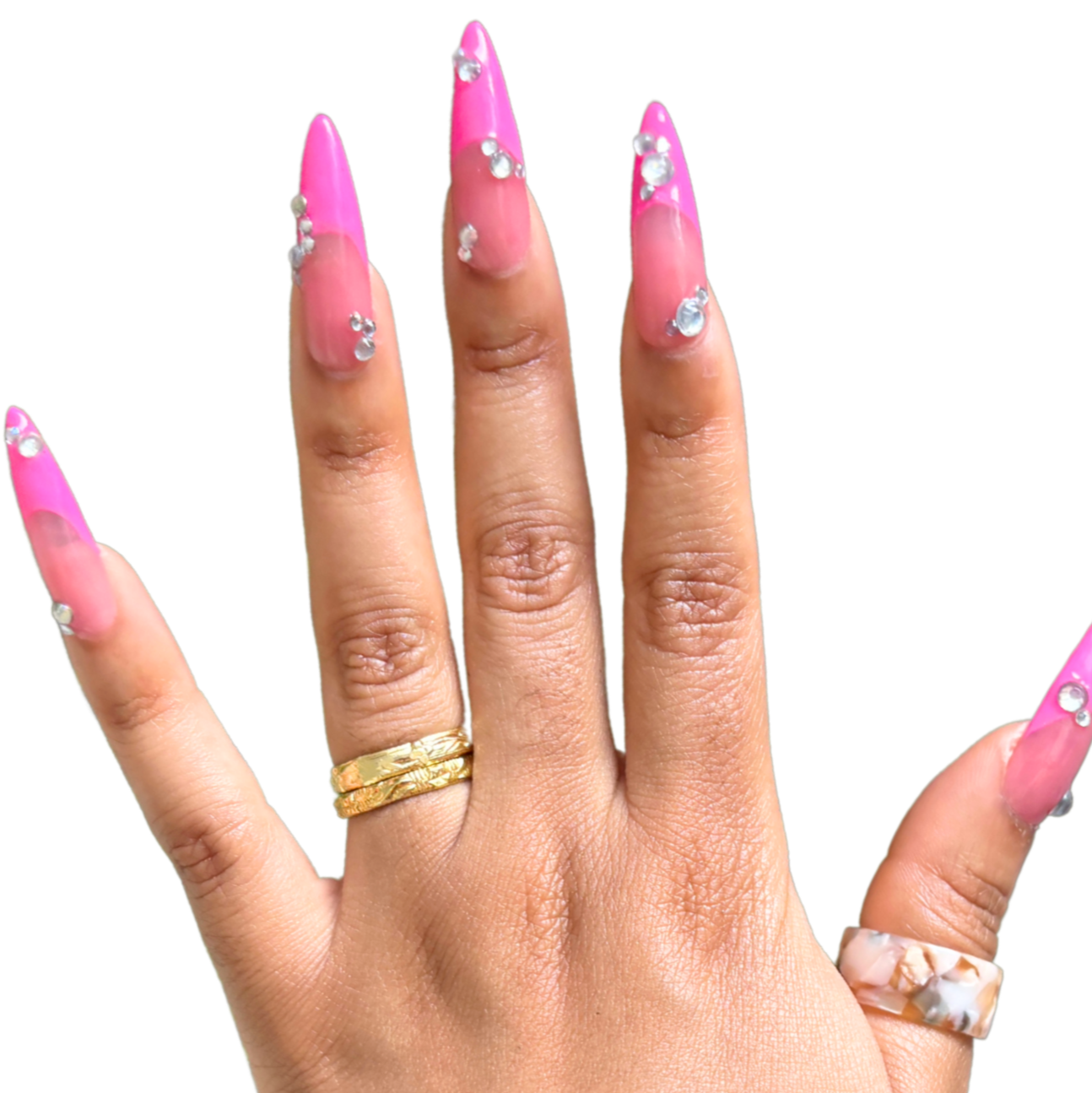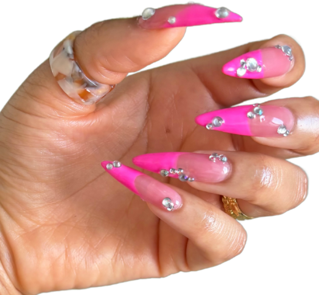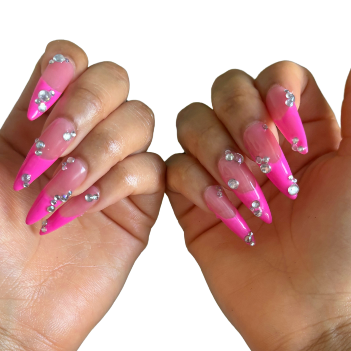 Pink jelly base with hot pink french tips and crystal accents.