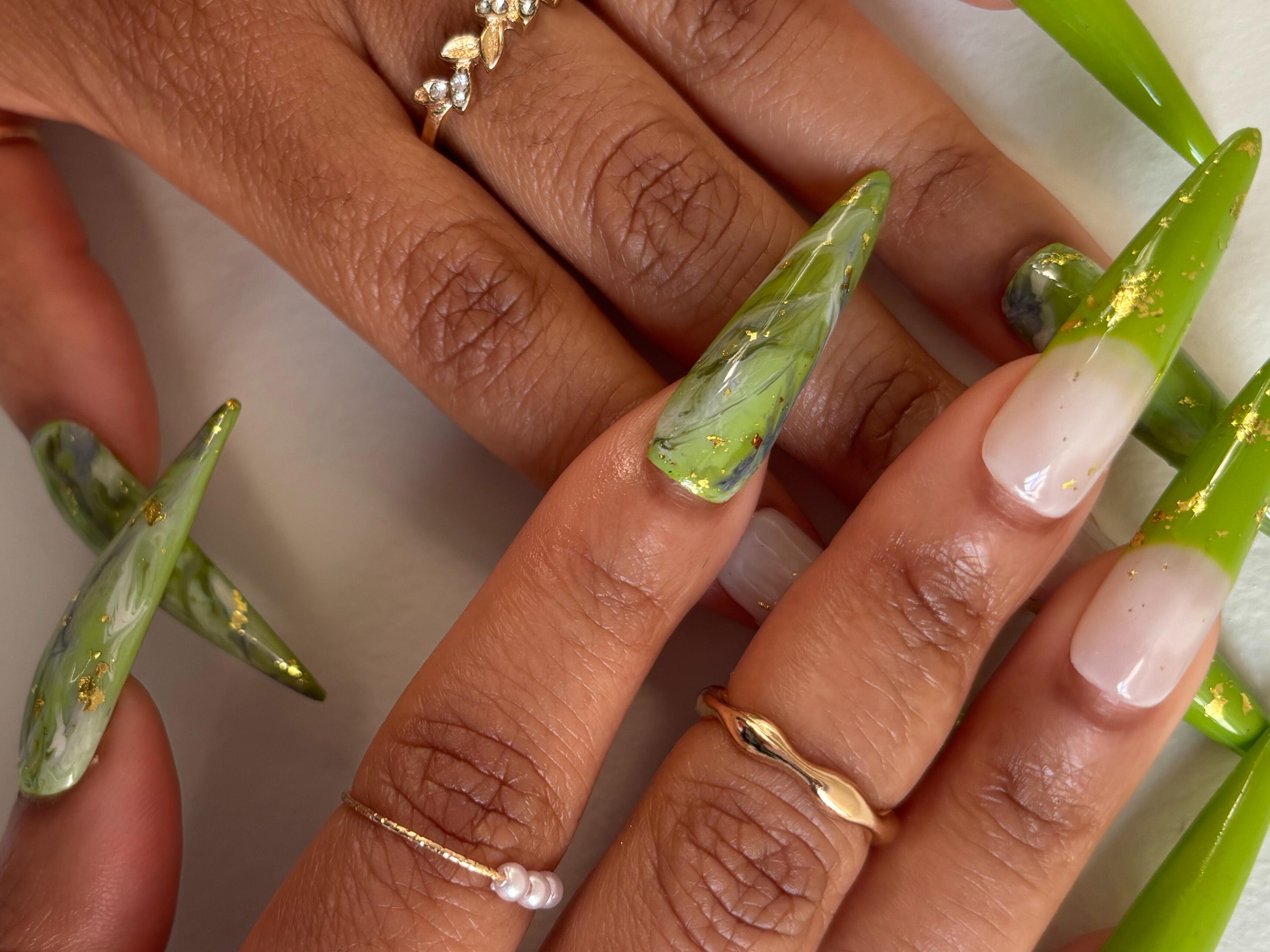 A luxury handcrafted set inspired by soft pistachio greens and marble details. Pressette Pistachio blends layered green tones, glossy finishes, and delicate gold accents to create a set that’s fresh, and elegant.