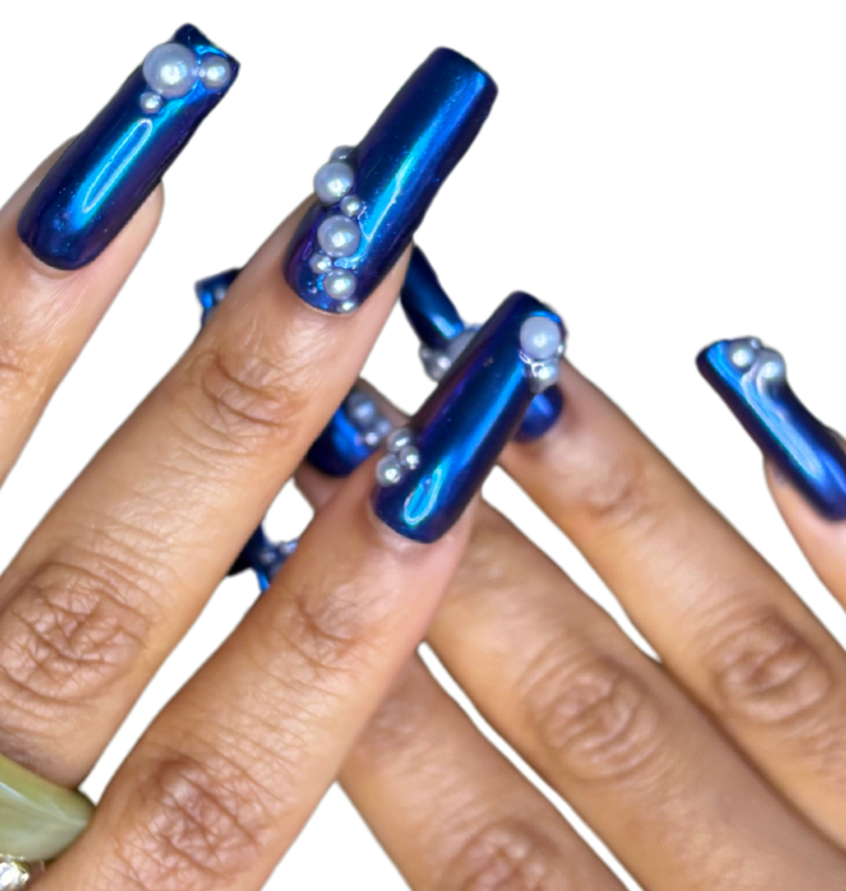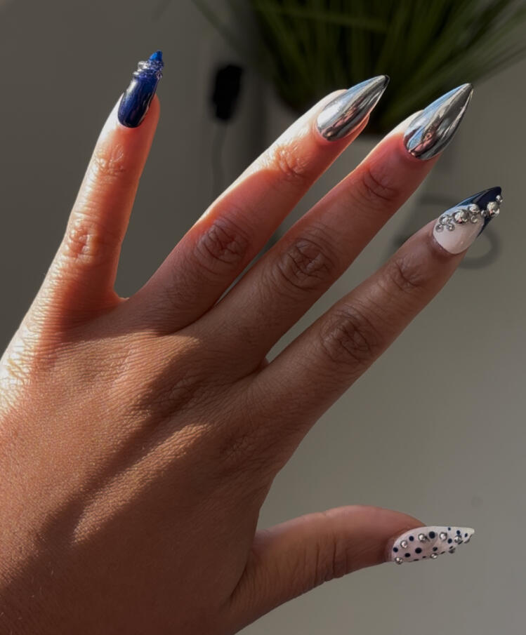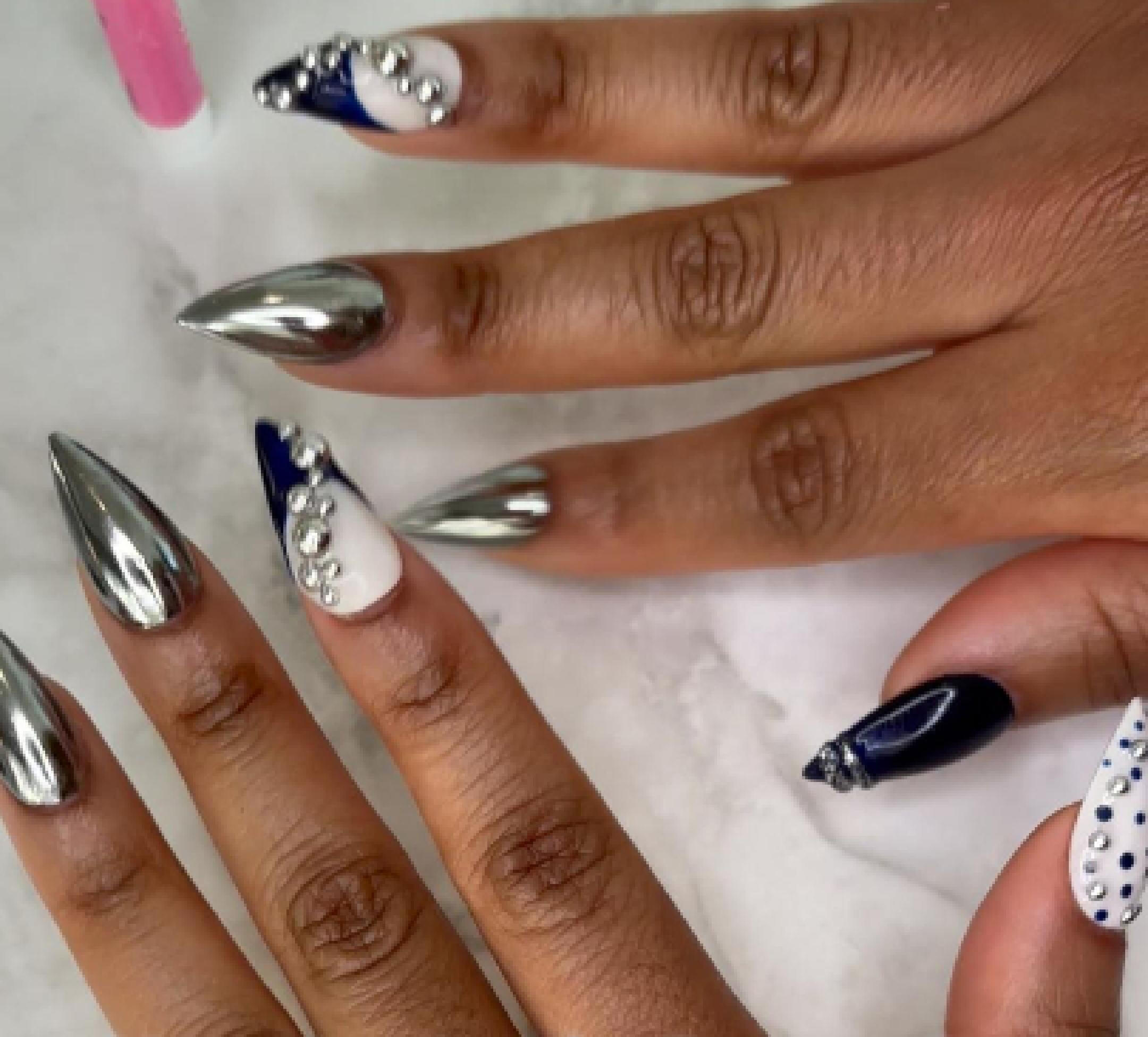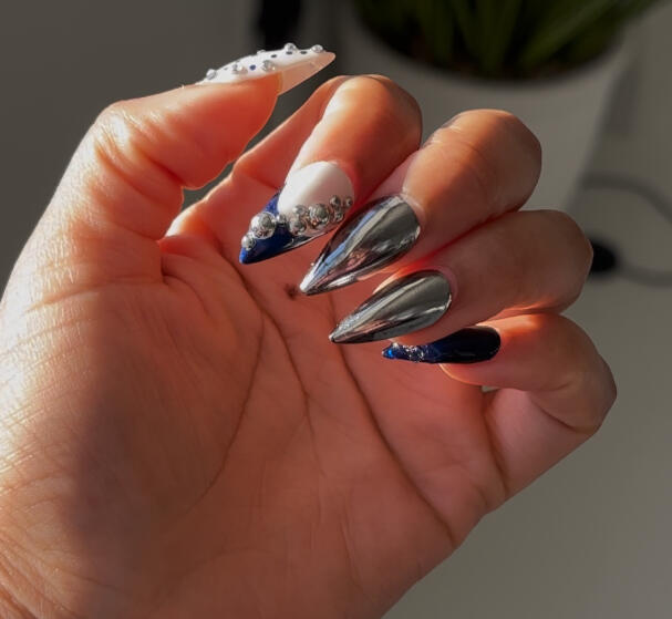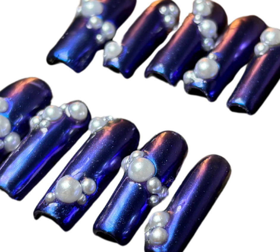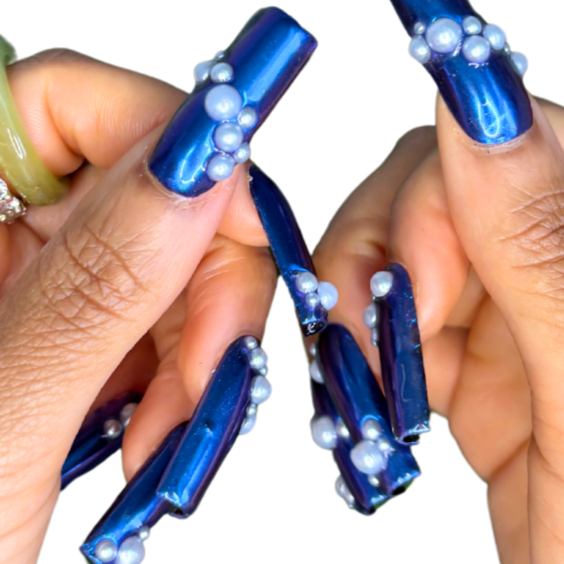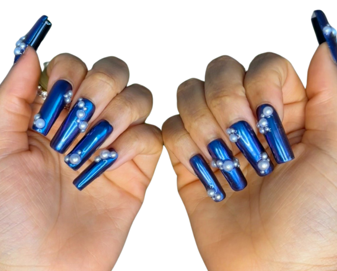 Midnight navy with mirrored chrome and 3d gel and silver chrome pearl accents. A true head turner. Avaliable in all shapes and lengths.