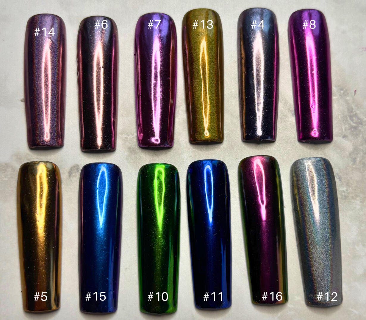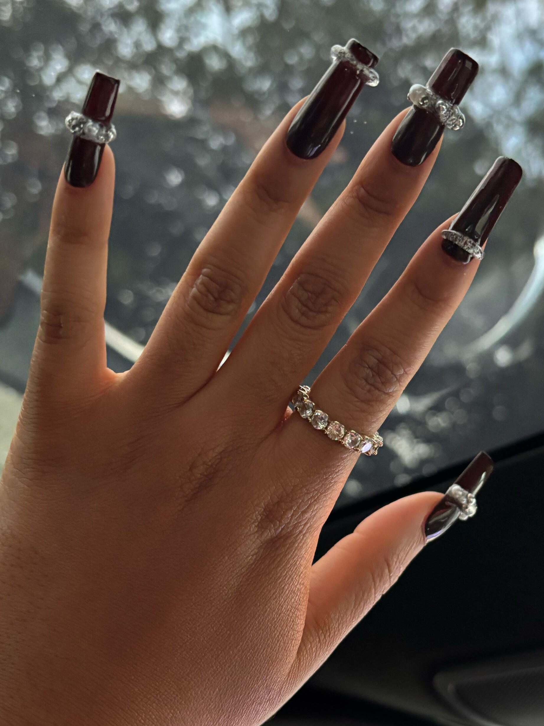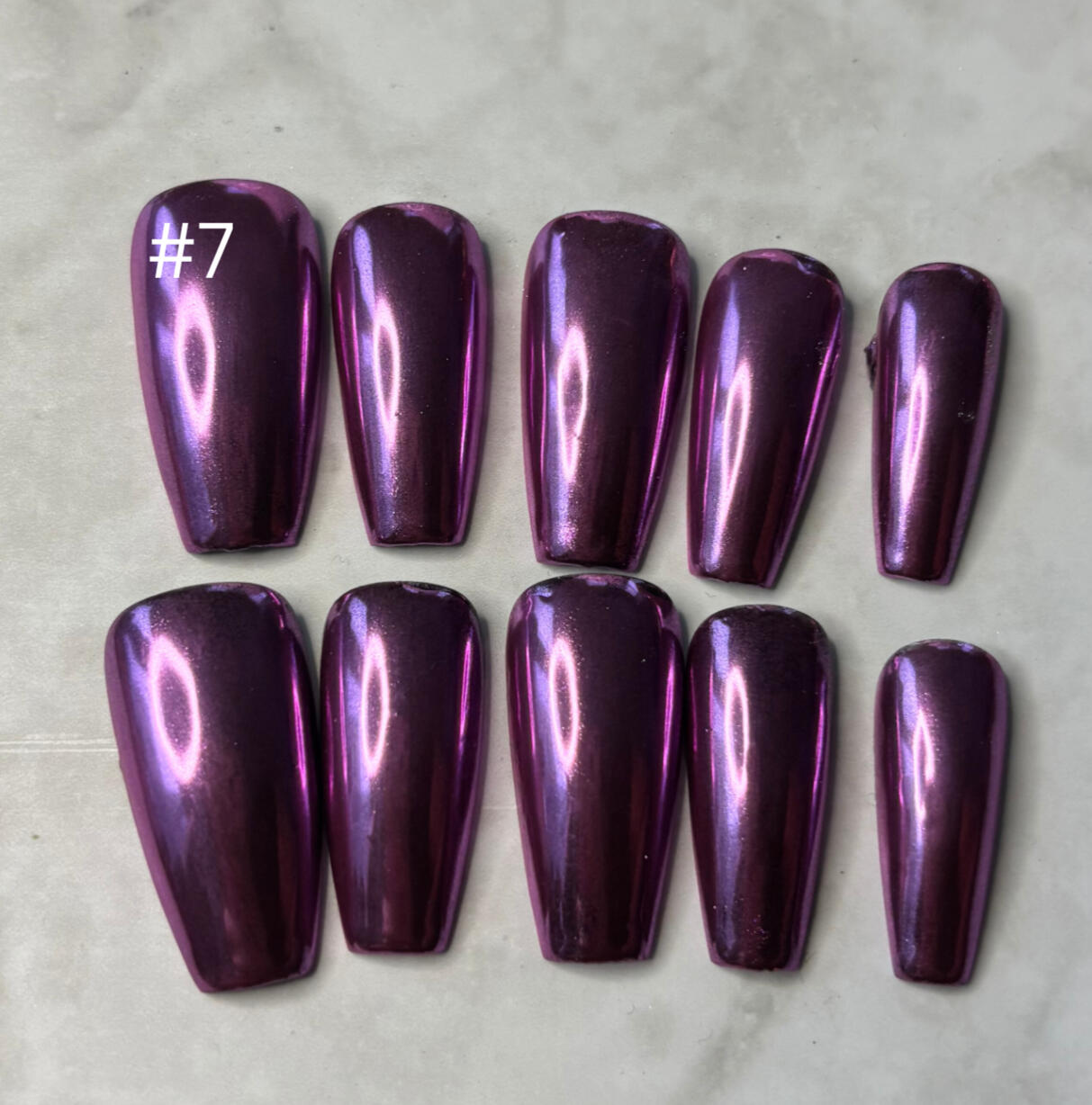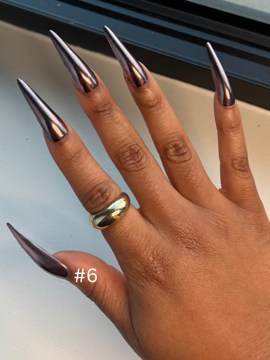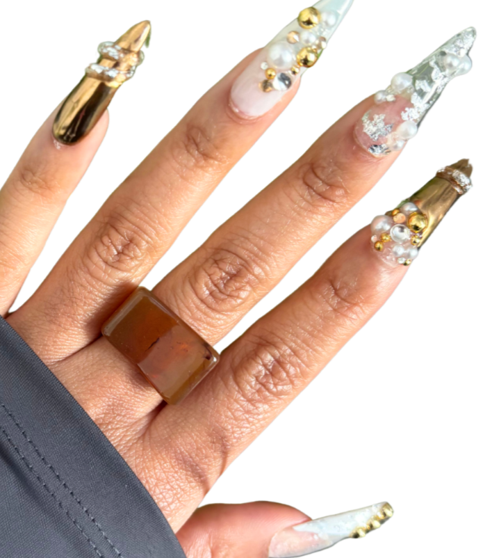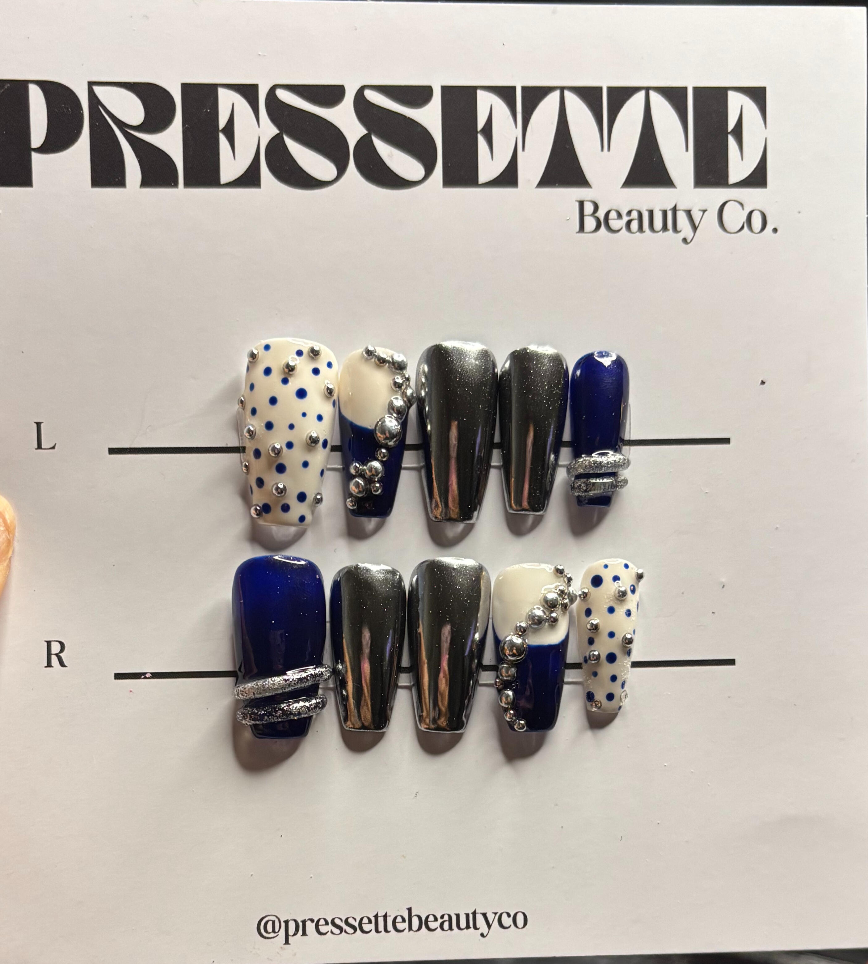 Midnight navy with mirrored chrome and 3d gel and silver chrome pearl accents. A true head turner. Avaliable in all shapes and lengths.