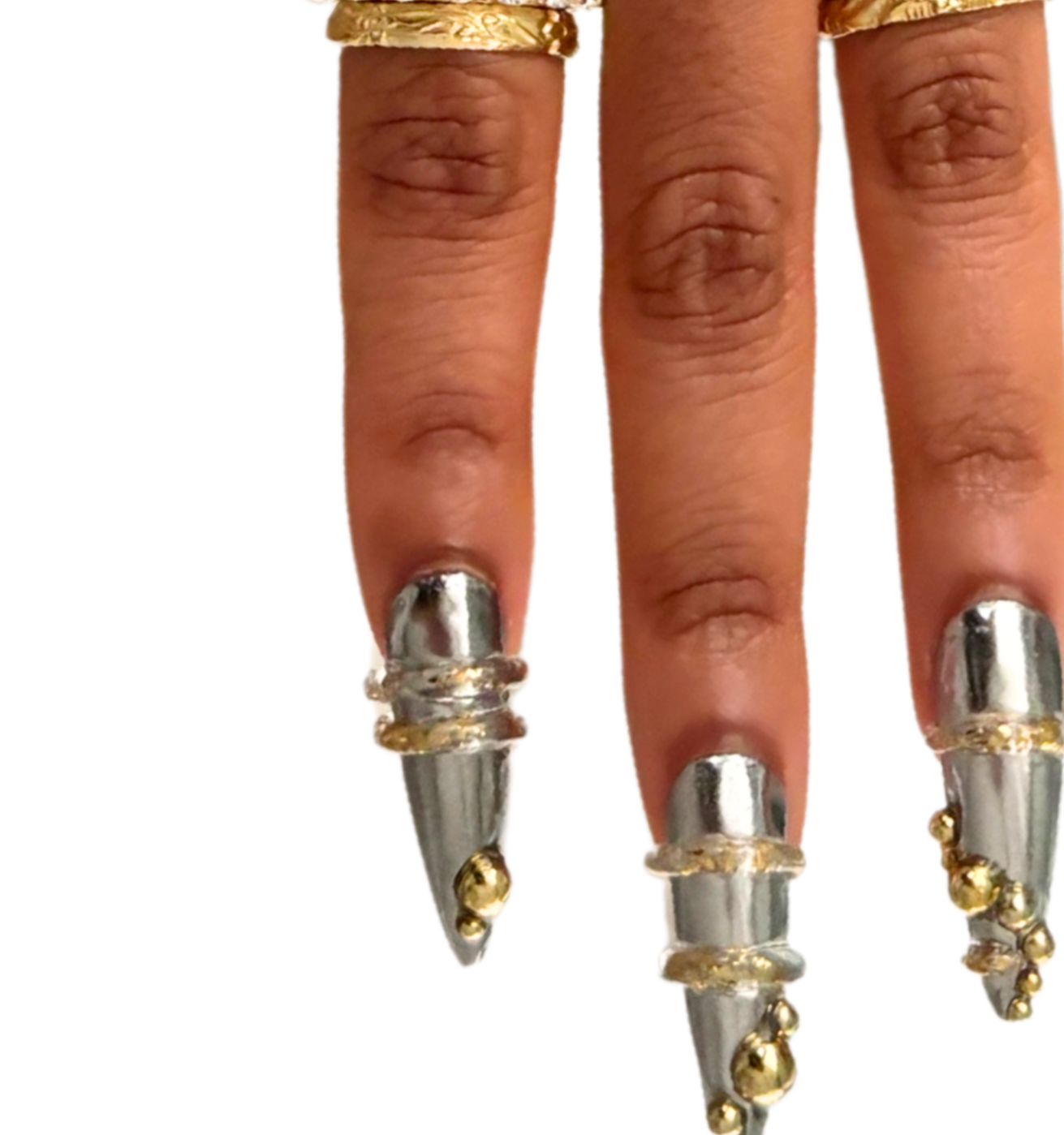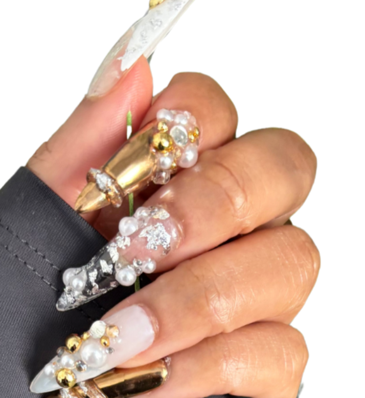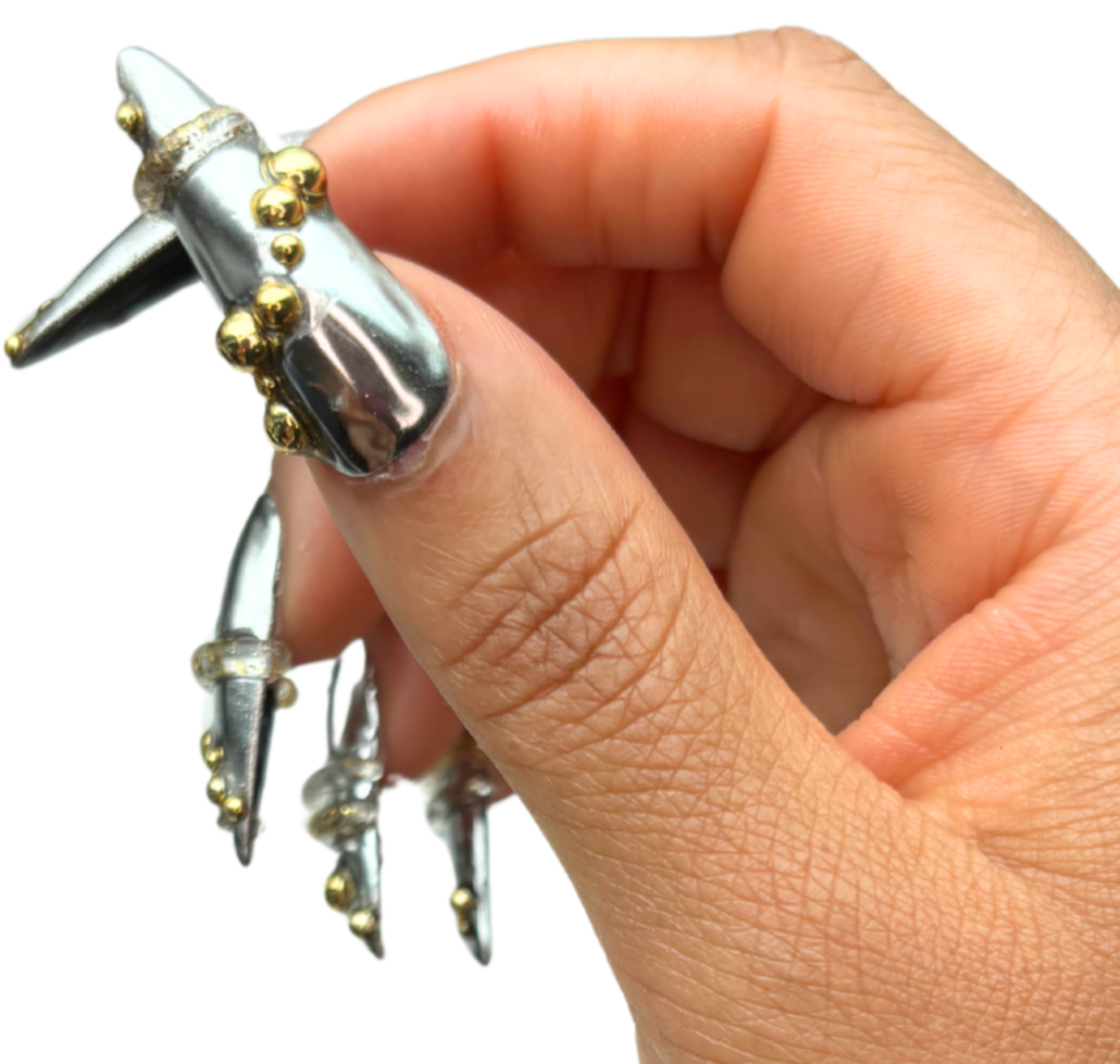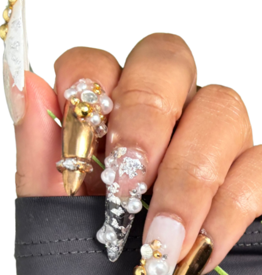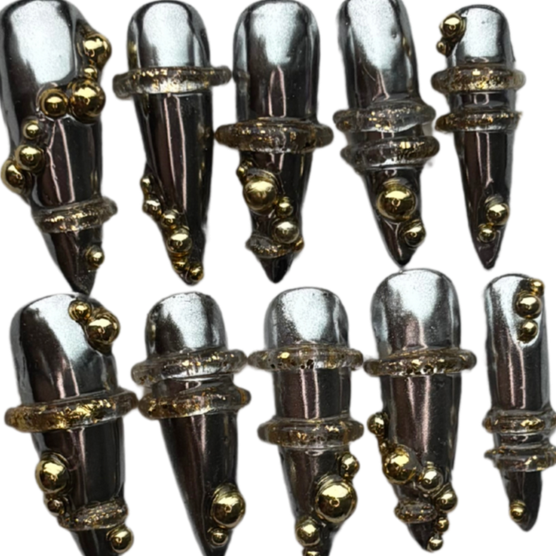 Silver chrome stiletto nails with 3d gel designs + foil details and gold pearl accents.Pictured: Long Stiletto