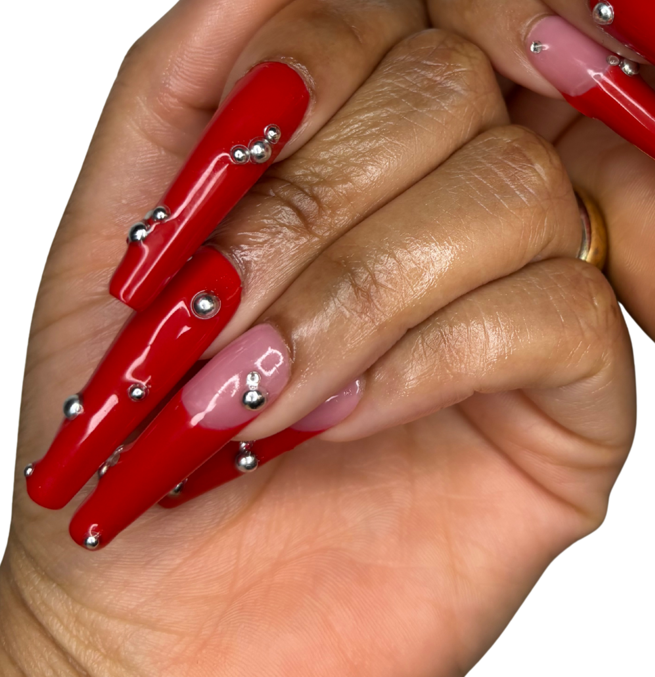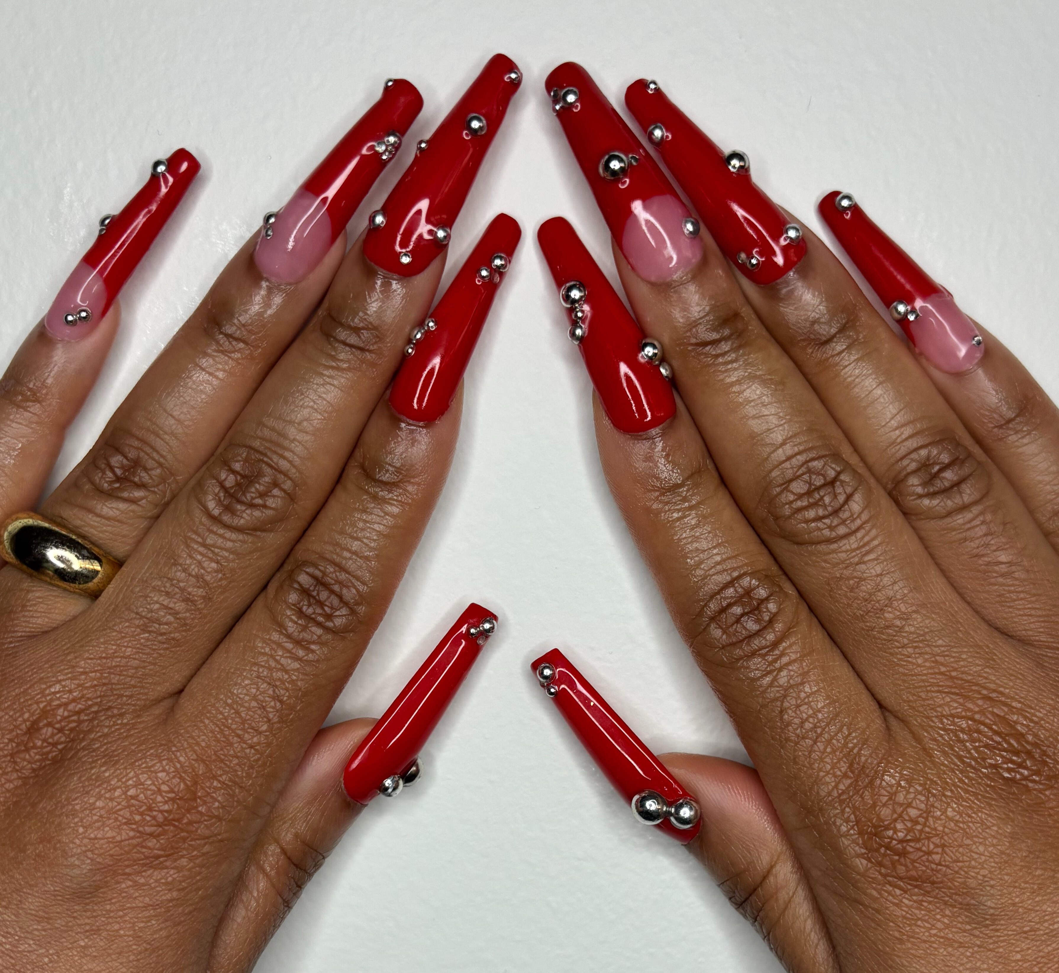 Glossy cherry red and chrome silver pearl details with french tips on two fingers per hand.