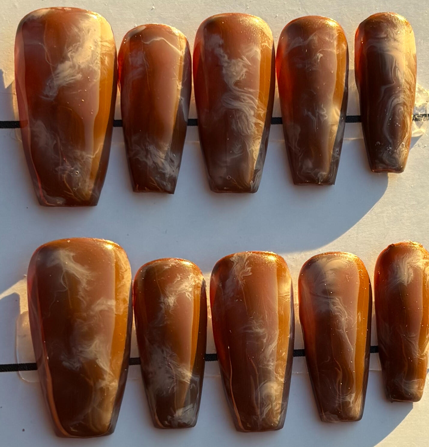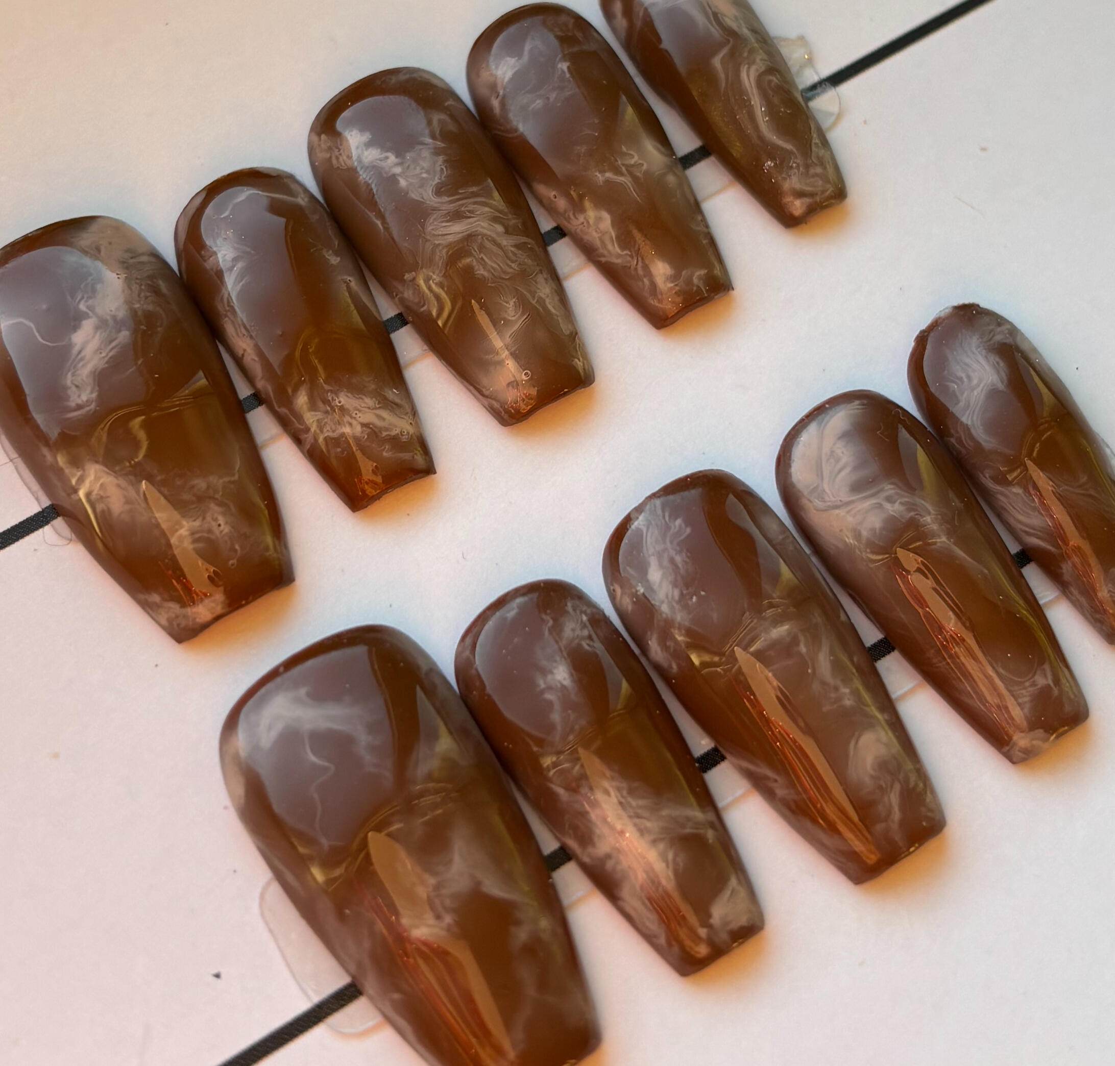 Brown base with light brown marble detail. Glossy Finish